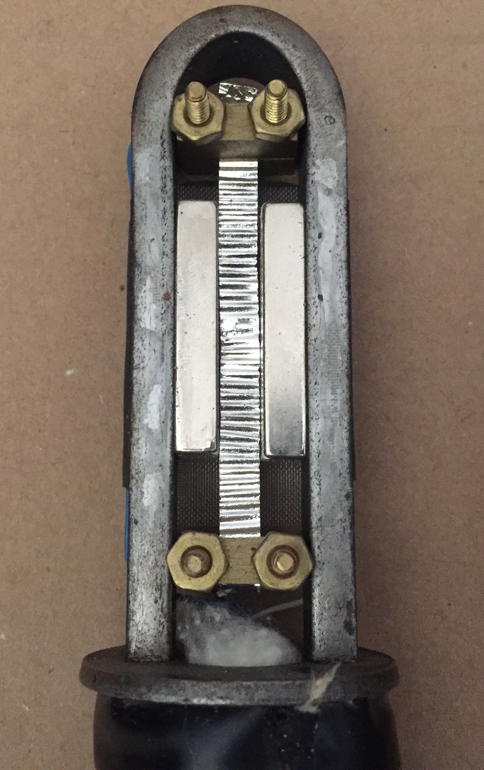 Here is a close up of the transducer. Finally moved on to Neodymium magnets with a proper closed magnetic circuit. The ribbon is pretty beat up looking here -- this one has been through some abuse.