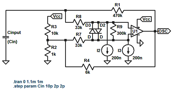 Touch sensors are everywhere these days, and can be designed really easily using an MCU, but the artist I was working for wanted something that worked similarly to a theremin for philosophical reasons. Now, a theremin works by extracting the beat frequency from two detuned high frequency oscillators, with one frequency fixed, and the other being varied by manually varying a capacitance. I didn't want to go too high in frequency because I wanted to use the bunch of NE5532s I had lying around, so I ditched the beat frequency thing. This design is based around an op amp relaxation oscillator, a simple peak detector and a comparator. I am only going to describe the first stage here because the output conditioning is super easy.