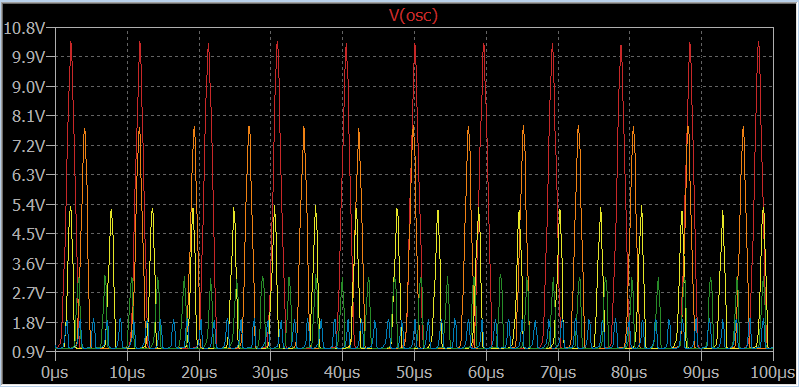 The capacitor labeled Cinput is the capacitance to ground of the person touching the input node, and it's value is stepped from 10pF down to 2pF in 2pF steps for a grand total of 5 transient simulation runs, as shown in the graph below, with red corresponding to Cin = 10pF and blue corresponding to Cin = 2pF.