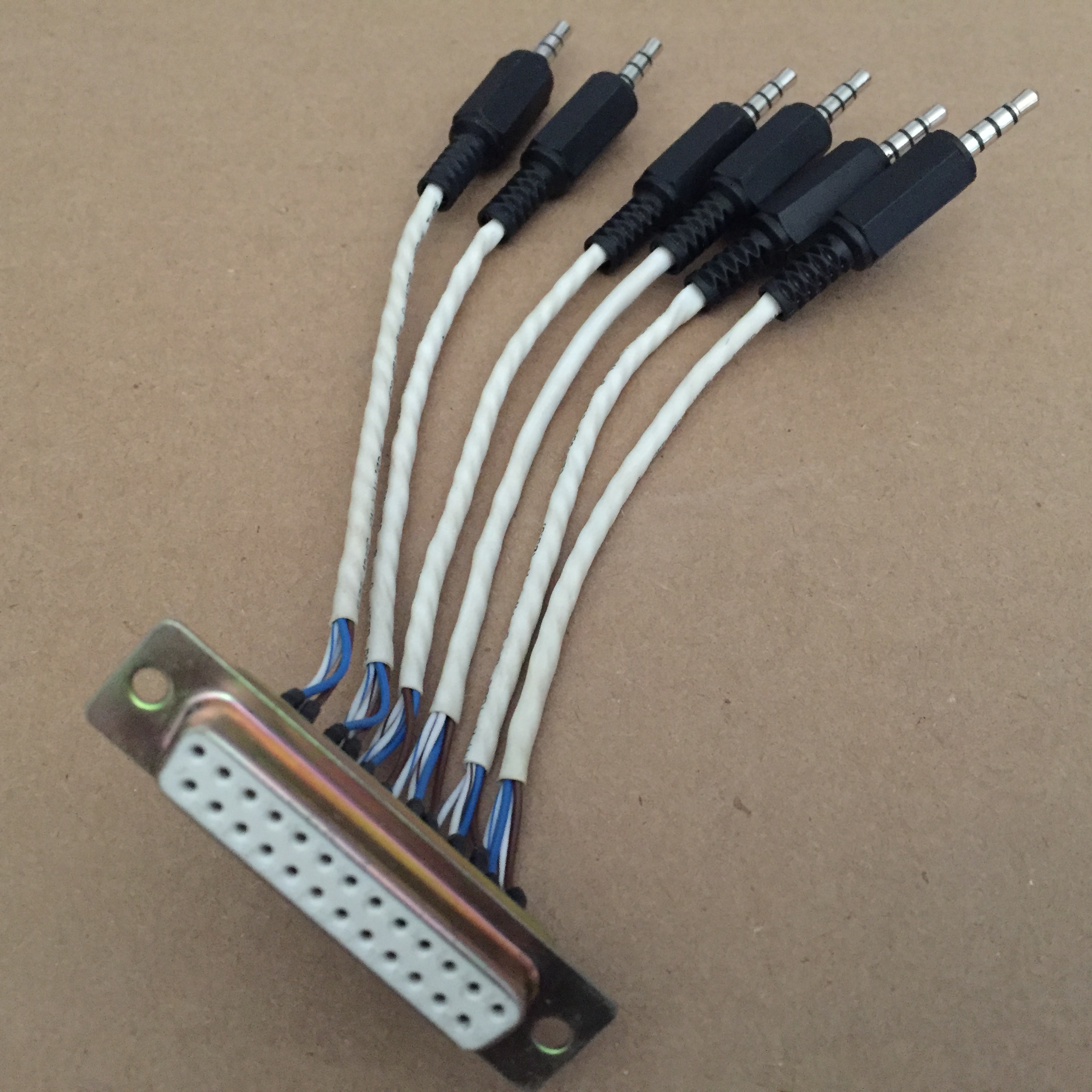 The outputs to the solenoid valves are the two pin molex connectors which might be hard to see in this picture, but there's nothing I can do about that. This unit takes a 12V power supply, and control signals for each channel, which come in at the million pin DSUB connector. I found the DSUB to be really convenient because you can get pretty long ones for fairly cheap. To convert from the phone jack output of the control module to the DSUB on the switch module, I made this little connector:
