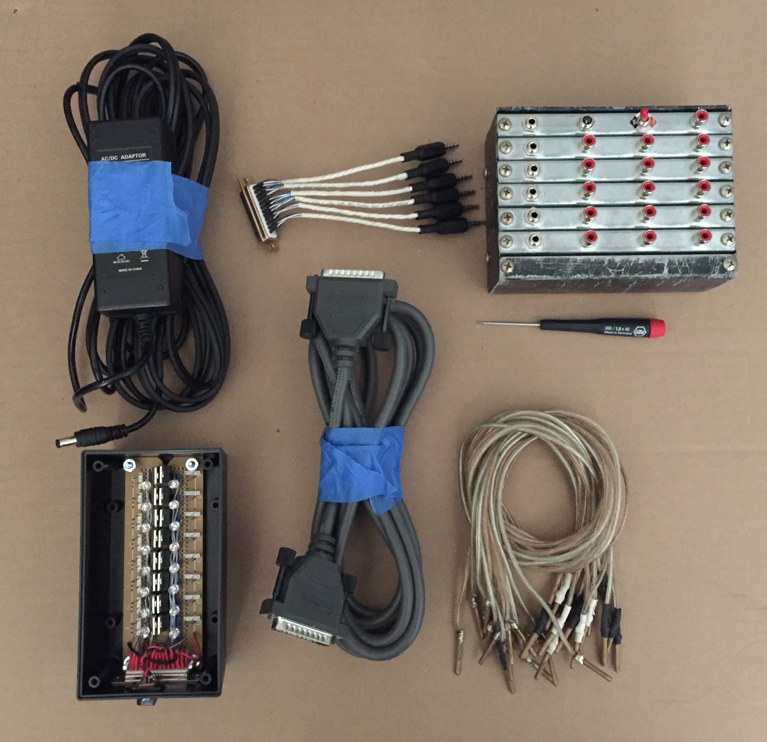 Anyway, the 1/8" phone jacks are the control outputs to the solenoid switches. There is also a power jack for a 12V power supply and a power switch for convenience. On th back side, there is access to two trimpots for each channel: