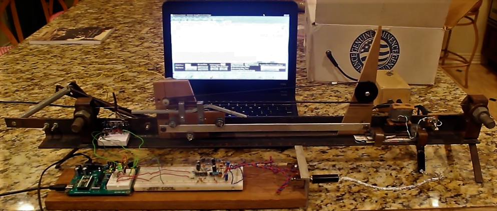 The cart/slide has a large enough friction and a small enough mass so that the transfer function of [position]/[input drive] can be reasonably approximated as an integrator K/s. However the relationship between the position and the frequency of vibration is nonlinear. Instead of attempting to linearize the plant model about some narrow range of positions, I decided just to ignore it, and see how the simple digital PID controller we used to control the temperature inside a test tube could adapt to it. Now, since I didn't have a great way to excite the string, I introduced a rather long delay in between measurements and output drive to allow me enough time to pluck the string while filming. Here's the video: