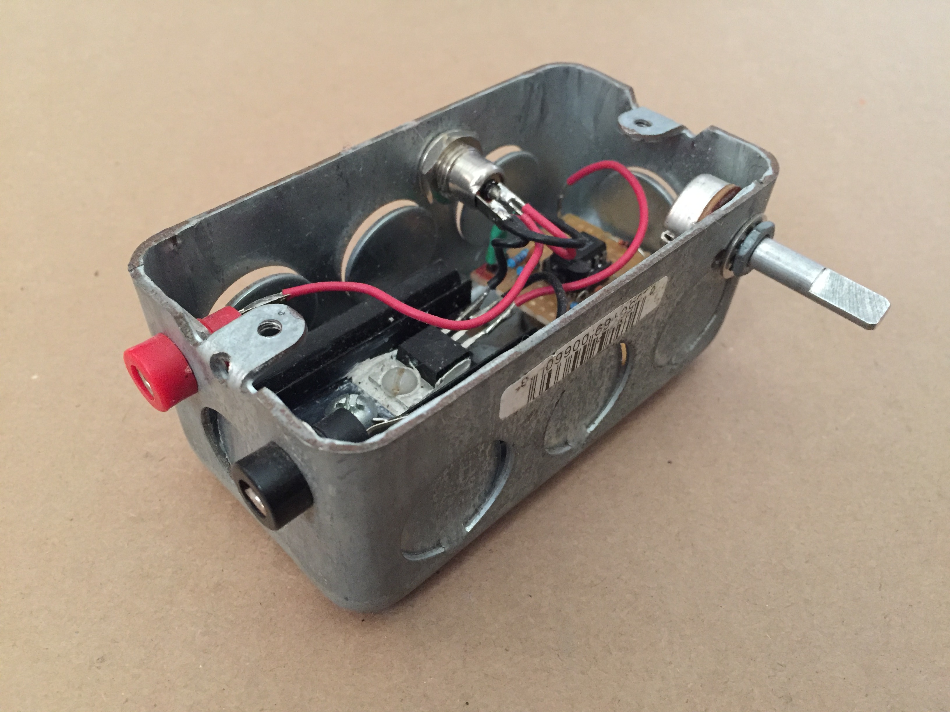 This is a really simple solution. It operates with a 12-50VDC power supply, and the only control is a single turn pot which varies the PWM duty applied to a low side switch. The cutting element is a length of 26AWG nicrome heater wire, which is connected to the controller via some low voltage outdoor lighting cable. The guage of the cutting element is a trade off - heavier wire is stronger, but lighter wire takes less current to get hot. 26AWG nicrome wire has a resistance per length of a little better than 2.6 ohms/foot, and it takes about 2A to get to foam cutting temperature (somewhere between 400F - 600F). I needed a cutter length of at least 4.5' which means a minimum resistance of about 12 ohms. That sets the minimum power supply voltage required at 24V. Now, I figured there could be a little loss in the connecting cables, and there could considerable loss in the switch since I didn't want to make a proper FET driver, so I figure just double it. Here is a little close up of the controller: