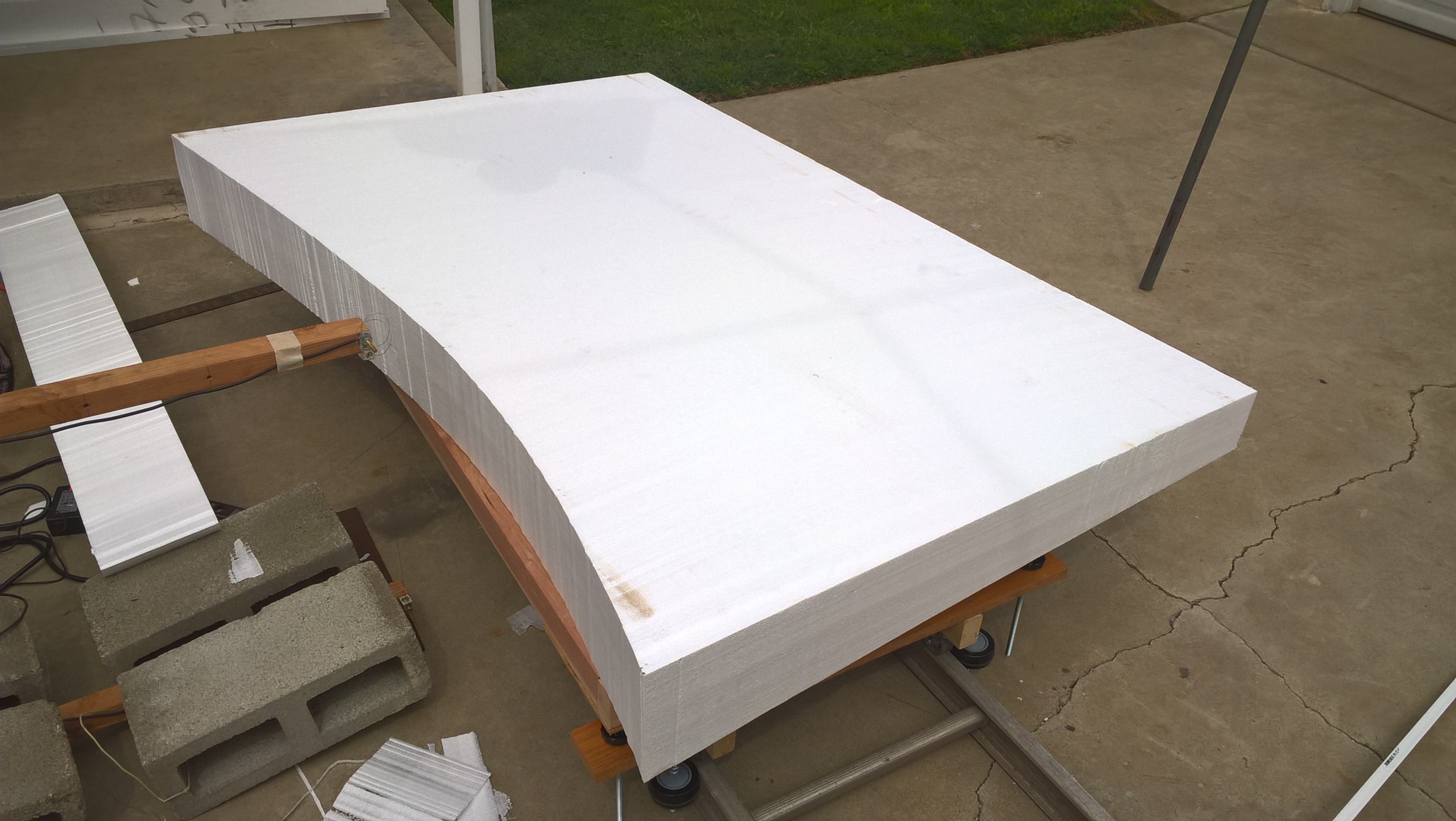 There were a bunch of other configurations too. Since I was going to be cutting from 4' X 3' X 8' blocks, I decided to make up a system with a cart on a track so I could just set the cutter and push the foam through it. Here is a picture of that setup -- the cutter isn't shown, but you can imagine the wire stretched between the posts to the sides of the foam block: